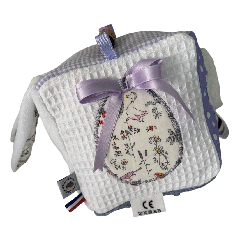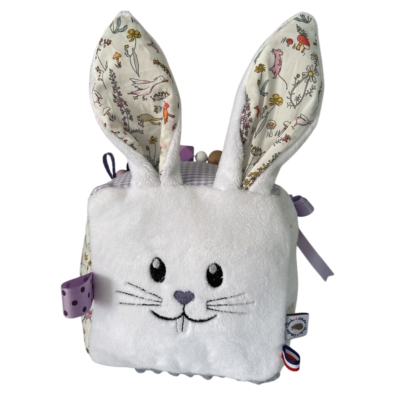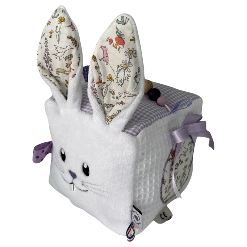 Offrez à votre bébé un univers de découvertes avec notre cube d’éveil avec toutes ces activités sonores et tactiles, entièrement fabriqué à la main en France. Ce jouet coloré et ludique spécial Pâques de couleur lilas avec ce petit lapin blanc est conçu pour stimuler tous les sens de votre enfant dès ses premiers mois.