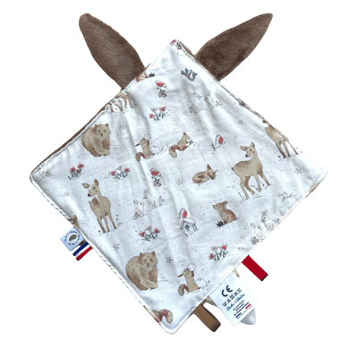 - Couleurs : face Minky Taupe , oreille animaux hiver et fleur minky taupe ; Dos tissu coton Animaux de la forêt en hiver